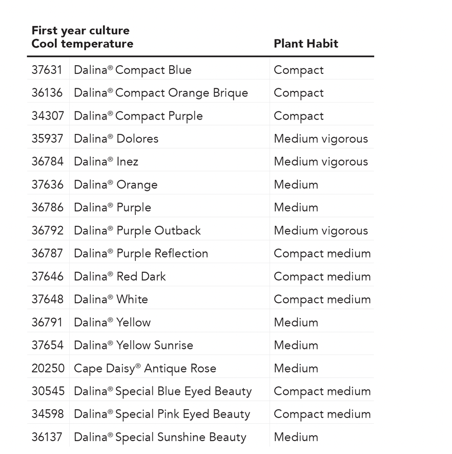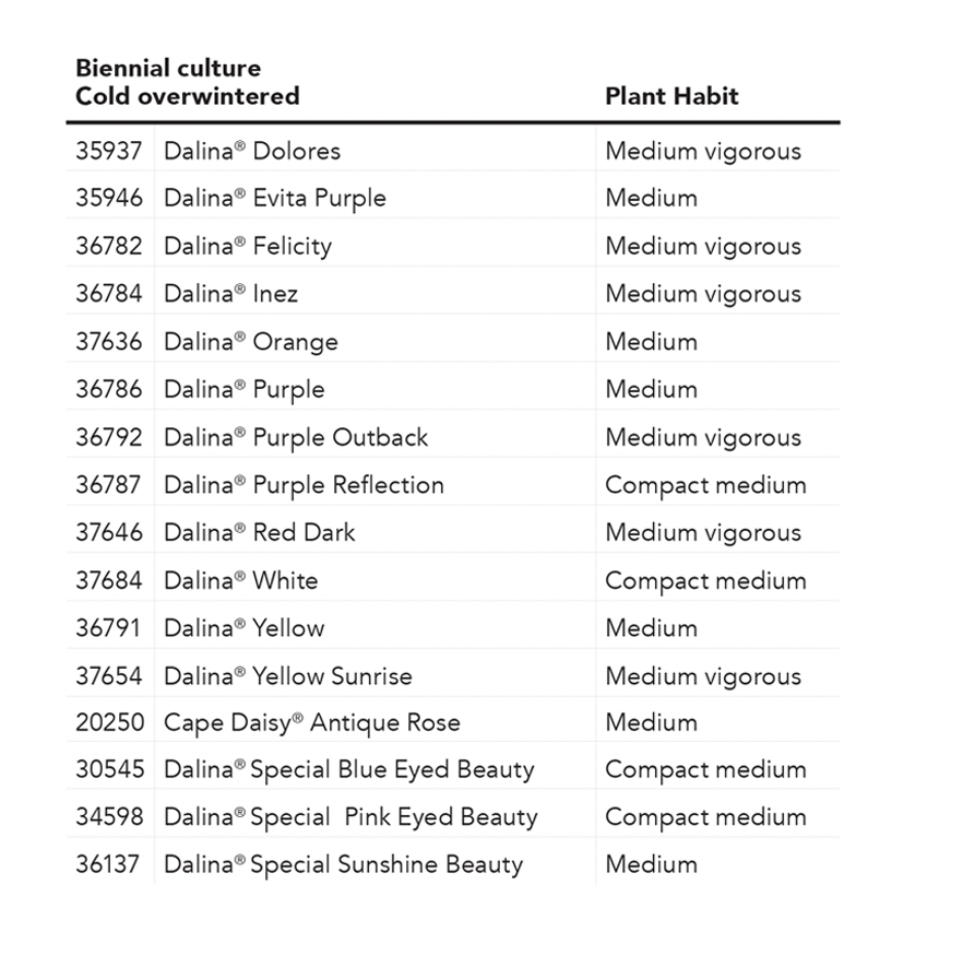 Geringer Hemmstoffbedarf, kein Stutzen und eine frühe Blüte - Dalina Compact sind der Schlüssel zum Erfolg in der Kultur von Osteospermum. Die Serie bietet eine breite Farbpalette und kann zusammen mit anderen Beetpflanzen kultiviert werden. Die Pflanzen haben mittelgroße Blüten und zeichnen sich durch eine gute Gartenleistung aus. Dalina Compact ist die perfekte Serie für kleinere Töpfe oder Packs. Bitte beachten Sie: Orange Sunrise hat einen etwas höheren Hemmstoffbedarf und baut nach einem zusätzlichen Stutzen besser auf. Die Blüten der Dalina Compact-Sorten bleiben auch bei weniger sonnigen Bedingungen geöffnet, was von großem Vorteil in der Vermarktung ist.