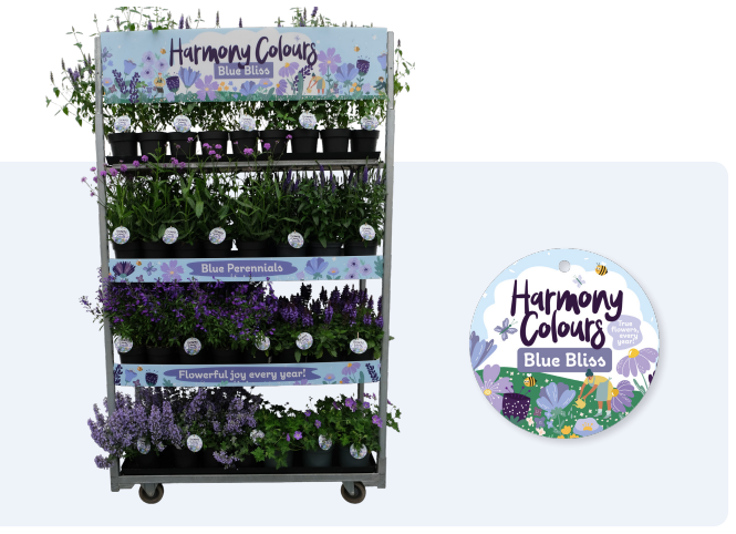 Blue Bliss präsentiert eine beeindruckende Auswahl blau blühender Stauden, perfekt arrangiert für aufmerksamkeitsstarke Präsentationen auf CC-Karren oder Tischen. Ideal, um im Handel ein starkes Farbstatement zu setzen und Verbrauchern eine sofort einsetzbare Palette für ein stilvolles Gartendesign zu bieten.